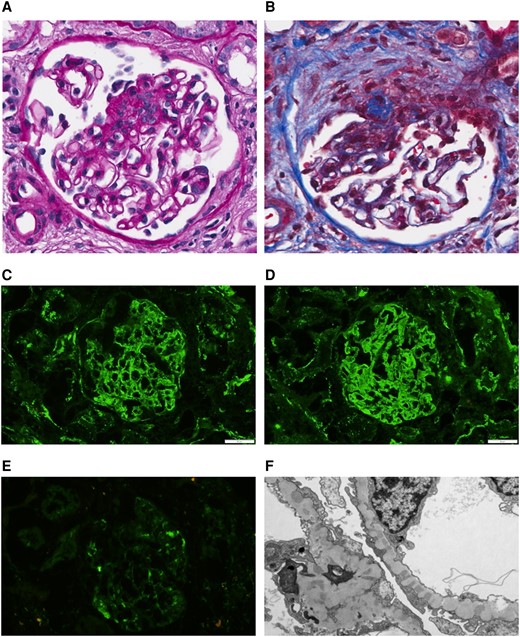 图2、组织学发现符合患者的严重狼疮性肾炎。高碘酸希夫(A)和马森三色(B)在用糖皮质激素和环磷酰胺治疗之前,患者的肾活检染色显示出细胞过多和增生,以及涉及鲍曼囊和肾小球簇的纤维细胞新月体。荧光免疫组织化学染色进一步显示弥漫性C3(C)和免疫球蛋白G(D)在整个肾小球的沉积以及C1q的低强度染色(E).电子显微镜(F)显示膜内和上皮下免疫沉积,具有来自肾小球基底膜的尖峰投射
