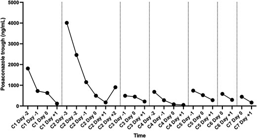 图3、环磷酰胺给药7个周期的泊沙康唑水平。此处显示的是在环磷酰胺每个周期前后测得的泊沙康唑水平。显示了环磷酰胺周期的编号(即C1-C7)以及相对于接受环磷酰胺的日期的日期(即第0天是接受每个环磷酰胺剂量的日期)