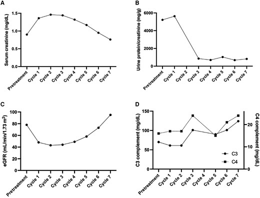 图4、以环磷酰胺为基础的治疗改善我们患者的狼疮性肾炎。基线时和环磷酰胺7个周期期间指示实验室值的纵向演变。显示了尿蛋白/肌酸酐比率(A),血清肌酐(B),通过估计肾小球滤过率(eGFR)计算的肾小球滤过率(C),以及补体蛋白C3和C4(D)
