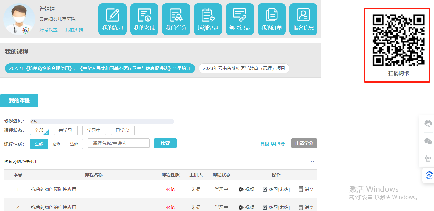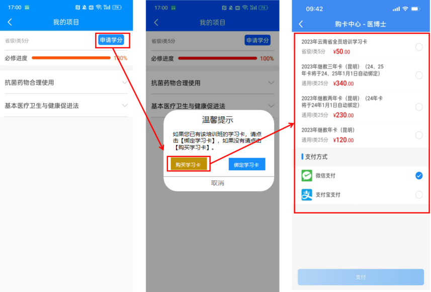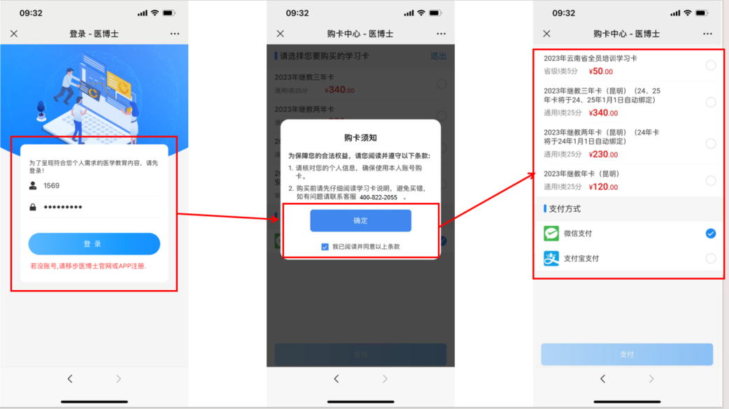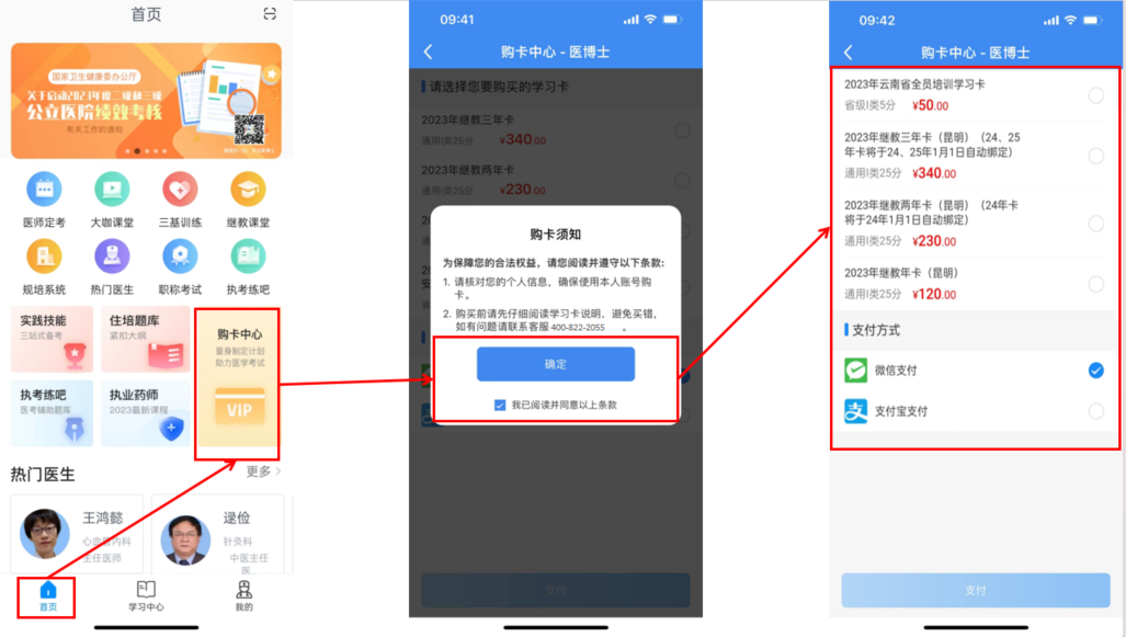 (2)手机端:进入“首页/学习中心”→“购卡中心”→阅读并确认购卡须知→选择需要购买的学习卡→完成付款→系统自动绑定学习卡至您医博士学员账号下。