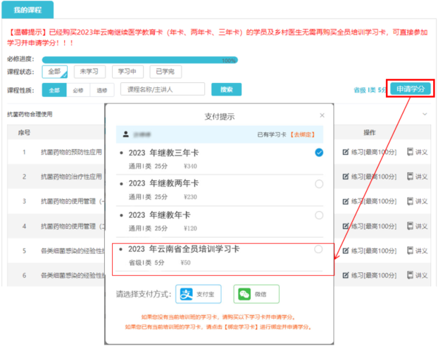 (2)手机端:完成学习后,点击“申请学分”→“购买学习卡”→选择需要购买的学习卡→完成付款→按流程提示完成学分申请。