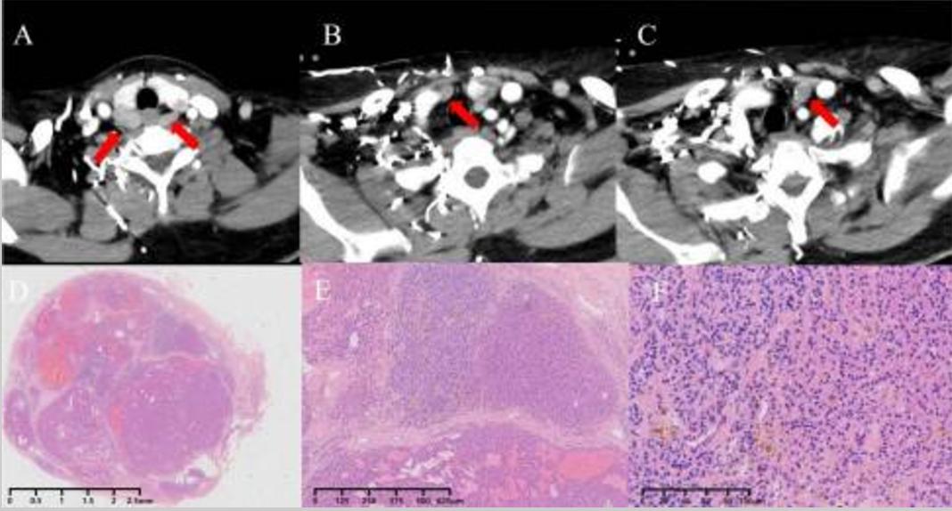 图1 增强CT扫描(A-C)显示四个轻度增强的原位甲状旁腺结节(箭头),位于甲状腺后部和下方。组织病理学((HE染色):A放大×40,B放大×100,C放大×200)显示由主要细胞组成的结节性增生