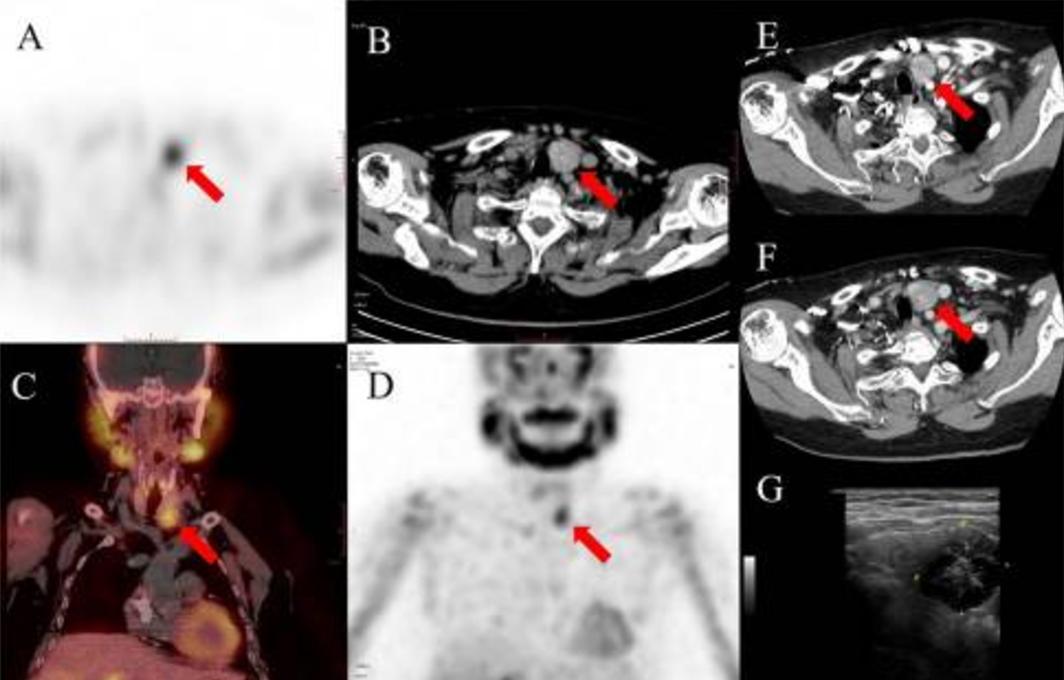 图2 99mTc-MIBI SPECT/CT扫描显示聚焦示踪剂积聚,位于左甲状腺下方的低密度结节(红色箭头:a SPECT、B轴位图像、C冠状SPECT/CT融合图像、D冠状SPECT图像)。对比增强CT扫描显示位于左甲状腺下方的中度增强的甲状旁腺结节(红色箭头)的动脉期(D)和延迟期(E)轴未图像。甲状腺左下叶有一个边缘不规则、钙质成分的低回声结节的超声图像(G)