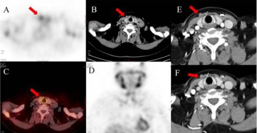 图3 99mTc-MIBI SPECT/CT扫描还显示轻度病灶示踪剂积聚,位于右侧颈部前部皮下低密度结节(红色箭头:a SPECT、B轴位图像、C轴位SPECT/CT融合图像、D冠状位SPECT图像)。对比增强CT扫描显示位于颈前部皮下的轻度增强结节(红色箭头)的动脉期(D)和延迟期(E)轴位图像