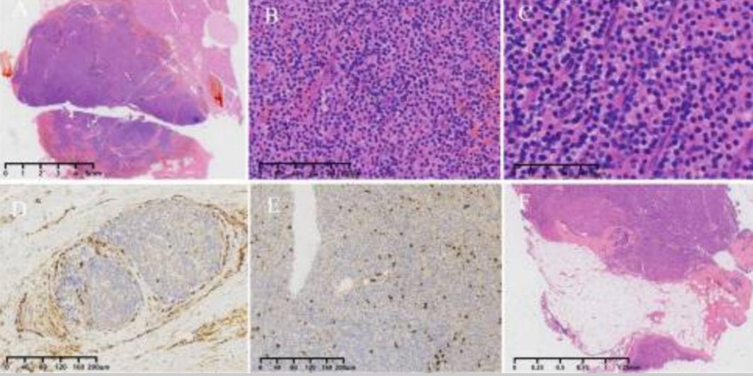 图4 组织病理学图像显示左甲状腺左下段甲状旁腺癌,主要细胞密集生长,结节上有纤维包膜(HE染色,放大倍数×10)。HE染色显示主要细胞实体生长,具有核多形性和有丝分裂计数增加(B放大倍数×200,C放大倍数×400)。ERG免疫组化染色(D放大×100)显示血管浸润的证据。Ki-67在甲状旁腺癌中的增殖指数超过5%(E放大×100)。右颈部皮下结节的组织病理学表现为结节内散在的良性增生甲状旁腺组织(F HE,放大×20)