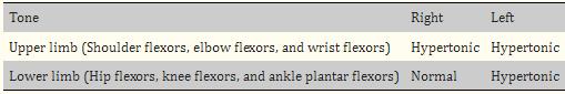 患者仰卧位,一般生命体征平稳,神志清晰,查体配合。肩部的外展和前臂的旋后肘和侧向伸展的手腕代表右上肢(UL)位置。左侧表现为内旋,肩部内收,手腕和肘部弯曲。臀部向外旋转,外展,并在双侧下肢(LL)伸展,踝关节跖屈,膝关节伸展(图1)。