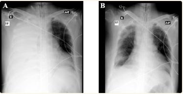 图1、病人的X光片。a:预插管胸腔造口术(患者仍处于心脏骤停状态);b组:胸腔造口术后引流尿液(ROSC实现)