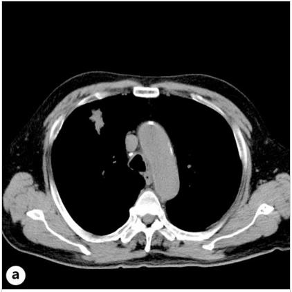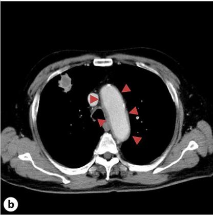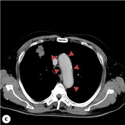 患者接受了卡铂/依托泊苷/杜伐单抗(Dur)和PEG-G-CSF的全剂量组合治疗,重点是剂量强度。在施用PEG-G-CSF后10天施用第四剂冠状病毒疫苗。在PEG-G-CSF给药后的第12天,出现38℃的发热和右耳疼痛,这种情况没有改善,并在第17天就诊。血液检查显示炎症反应明显升高,白细胞计数为15600/μL,C-反应蛋白为33.9 mg/dL,白细胞介素6 (IL-6)水平为114 pg/mL。然而,对整个躯干和头部的物理检查和简单的CT未能检测出发热源或炎症反应升高的原因(图一a)。虽然患者没有出现FN,但不能排除细菌感染的可能性,立即住院并使用了氨苄西林/舒巴坦。第二天对整个躯干进行的CE-CT显示主动脉弓降胸主动脉周围的脂肪组织密度增加,提示主动脉炎(图一b)。患者抗中性粒细胞胞浆抗体和其他自身抗体检测呈阴性。有乙型/丙型肝炎病毒(HBV/丙型肝炎病毒)感染史,入院后有退热趋势,并接受过ICIs治疗。因此,在没有全身皮质类固醇治疗的情况下,仅用解热镇痛药并进行了仔细的随访。第20天,患者体温改善至36°C,右耳疼痛和炎症反应逐渐改善,第33天的对比CT显示主动脉周围炎症表现改善(图一C,2)。那时血清IL-6水平降至8.7 pg/mL。由于免疫相关不良事件的可能性仍然存在,卡铂/依托泊苷的剂量减少到80%,Dur在第二个疗程的化疗中被停用。患者的病情进展顺利,除了白细胞计数略有下降。剂量减少的卡铂/依托泊苷以4周的间隔继续治疗,患者的进展良好,没有主动脉炎发作的迹象。