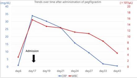 图2、白细胞(WBC)计数和C反应蛋白(CRP)趋势线图。蓝线表示CRP水平的趋势,红线表示WBC计数的趋势。在PEG-G-CSF给药后的第17天,CRP水平和WBC计数都异常高。然而,在没有给予皮质类固醇的情况下,它们继续减少,并且在给予PEG-G-CSF的第33天几乎正常化