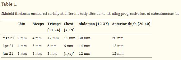 在开始使用派姆单抗十个月后,出现了原发性甲状腺功能减退和继发性肾上腺功能不全,并开始接受替代治疗。治疗后大约15个月,出现新发的需要胰岛素的糖尿病,但没有与1型糖尿病相关的自身抗体。患者颧弓突出,颊脂垫缺失(图1)临床上发现有肝肿大。躯干和四肢上的皮下脂肪被保留下来,正常的皮褶厚度测量证明了这一点(表1)。