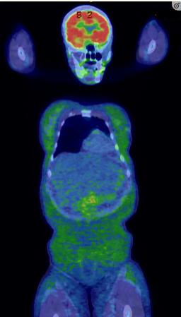 图2、全身FDG-PET扫描显示弥漫性轻度皮下FDG活动,提示脂膜炎