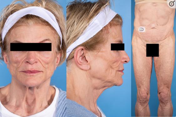 除了新发糖尿病,患者还出现了新的代谢异常,包括高甘油三酯血症436mg/dL(4.93 mmol/L)[参考范围:< 150 mg/dL (<1.7 mmol/L)]和肝酶升高(正常上限的3-4倍)。随后的肝活检显示严重的大泡性脂肪变性,没有任何脂肪性肝炎的证据。值得注意的是,在初始评估期间测量的血清瘦素浓度无法检测到<0.6 ng/mL (参考范围:3.3-18.3 ng/mL)。用于癌症监测的全身FDG-PET显示整个皮下组织存在轻度弥漫性FDG活动,提示为脂膜炎(图2)。然而,临床上没有提示脂膜炎的迹象。在接下来的3个月里,体重减轻了20公斤,并伴有从头至脚的全身皮下脂肪减少(图1和3)并继续具有显著的低瘦素血症。