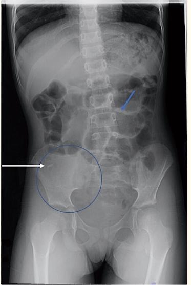图1、初始X光照片显示右下象限的软组织密度(蓝色圆圈)。其内部呈线性高密度,代表沙子的凝结体(白色箭头)。小肠和大肠的充气环扩张是发展中的梗阻的隐患(蓝色箭头)