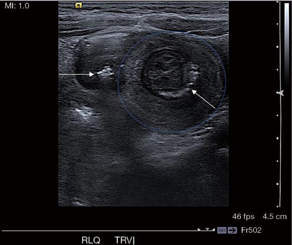 图2、超声显示右下象限肠套叠,目标征为肠壁的交替高回声和低回声环(蓝圈)。肠套叠内也可见回声砂粒聚集(白色箭头)