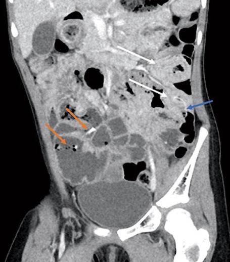 图3、CT显示多个小肠/小肠肠套叠(白色箭头),肠套叠处有高密度砂粒结石(蓝色箭头)。在右下象限(橙色箭头)还可以看到高密度的沙结核