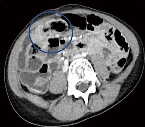图4、轴向对比增强计算机断层扫描图像显示疑似结肠肠套叠(蓝圈)