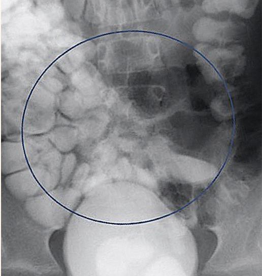 腹部和骨盆的CT与静脉造影显示多个突出的空气和充满液体的肠袢贯穿腹部。结果涉及回肠-回肠、回肠-结肠和结肠-结肠肠套叠累及远端横结肠/近端降结肠(图3、4、3、4)。在影像学证实的情况下,通过荧光剂对比灌肠对回肠-结肠肠套叠进行复位。插入一根儿童直肠管,通过重力将约360cc稀释的泛影葡胺直接注入结肠。本研究发现造影剂在整个结肠内自由流动,容易回流到回肠末端,表明在此手术之前成功减少或自发消退了轻微的回肠-结肠肠套叠 (图5)。
