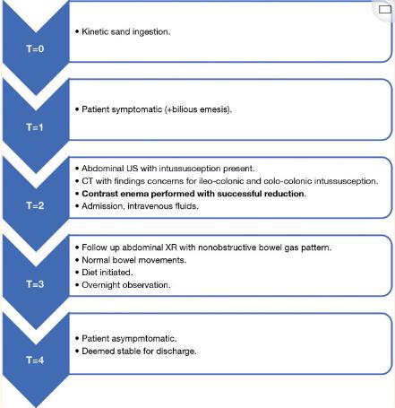 摄入太空沙会导致肠梗阻和结肠肠套叠。肠套叠被认为是一种医疗急症,应在潜在的致命并发症发生前尽快治疗。肠套叠的后果从良性症状(如便秘)到更严重的并发症,包括肠穿孔、腹膜炎、肠坏死和败血症。本文管理方案包括流体静力复位、肠道休息、静脉水合、随访成像和在医院的受控环境中观察。持续呕吐时应进行胃减压。一旦患者无疼痛且无肠梗阻的临床或影像学证据,则允许其饮用清澈的流质饮食。本报告旨在提高对摄入太空沙潜在危险的认识,并强调通过复位灌肠对肠套叠的标准管理在这种临床情况下也是有效的。