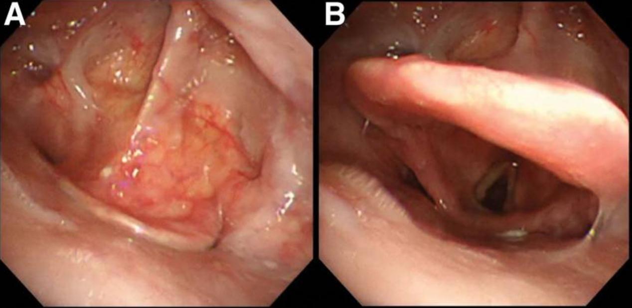 图1 吸气(A)和呼气(B)期间的支气管镜图像显示会厌后屈导致吸气期间的气流堵塞