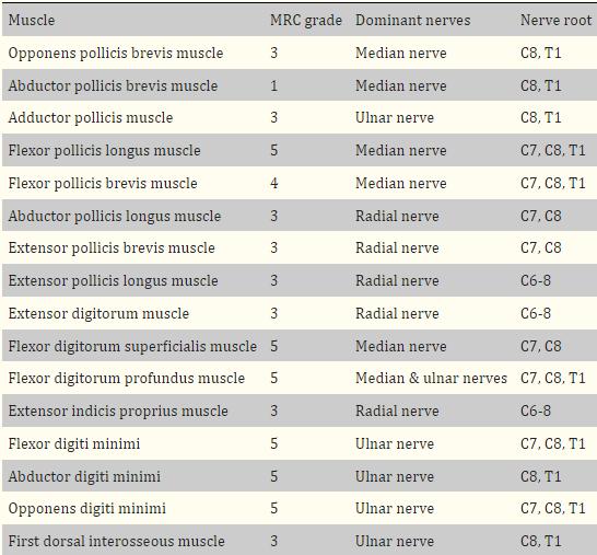 表1、右手手指肌肉力量、支配神经和神经根水平的结果