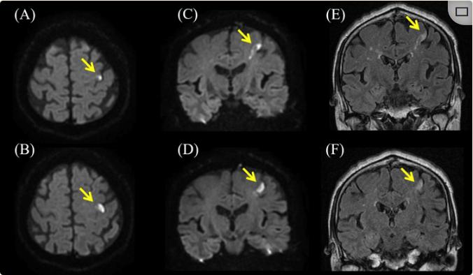 (A,B)弥散加权脑轴MRI显示左侧中央前回中央前结节(PK)高信号(箭头)。(C,D)弥散加权脑冠状MRI显示左侧中央前回高信号(箭头)。(E,F)T2加权液体衰减反转恢复脑冠状MRI显示左侧中央前回高信号,与扩散加权成像(箭头)一致