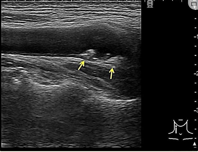 颈动脉超声显示双侧颈动脉球的斑块(箭头,此超声图为右侧)