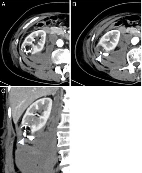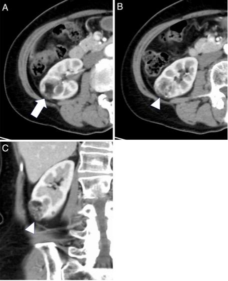 图1、肾血管平滑肌脂肪瘤破裂的患者2年前对比增强计算机断层扫描(CECT)。CECT显示右肾后下段一个18×21×25 mm的混合密度肿块,包括脂肪(A,箭头)和丰富的血管成分(1B和1C,箭头)。CECT显示高血管病变突出至肾周间隙,但未见瘤内大于5mm的动脉瘤(1B和1 c,箭头)