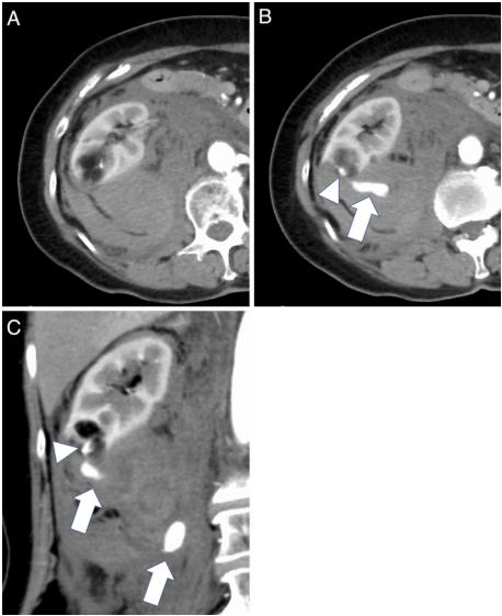 图4、经导管动脉栓塞后10天的增强ct显示出血部位充满了n -氰基丙烯酸丁酯-脂醇铸型(箭头),显示血肿缩小