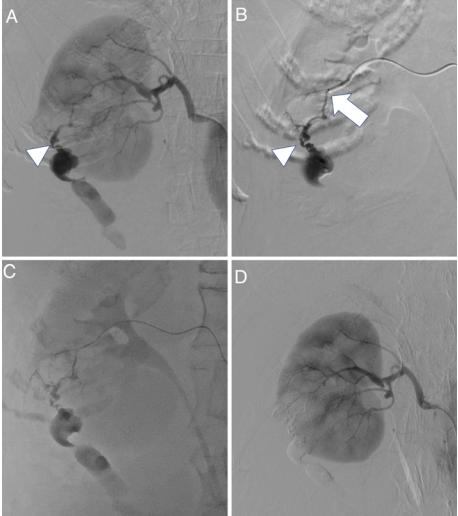 图3、(A)右肾动脉造影显示微动脉瘤外渗大量造影剂(箭头所指)。(B)肾动脉分支选择性血管造影;箭头指向微导管的尖端。(C)将破裂的微动脉瘤和近端动脉分支以1:2比例(33% NBCA)的氰基丙烯酸酯-脂醇混合物栓塞。(D)栓塞后血管造影显示造影剂外渗停止