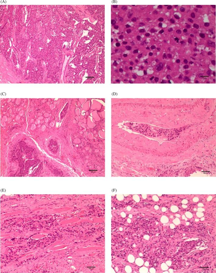 图3 苏木精和伊红染色:(A)为甲状旁腺癌肿瘤细胞(比例尺=250μm,×40);(B) 肿瘤细胞的核分裂(比例尺=25μm,×400);(C) 甲状腺组织侵犯(比例尺=250μm,×40);(D) 血管侵犯(比例尺=100μm,×100);(E) 横纹肌组织侵犯(比例尺=100 μm,×100);(F) 脂肪组织侵犯(比例尺=100 μm,×100)