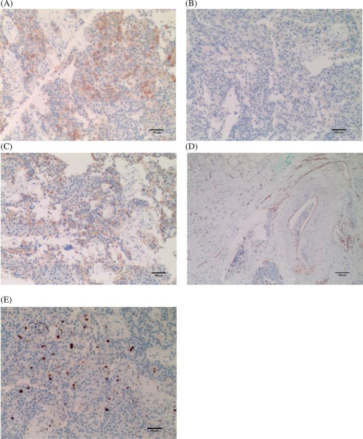 图4 免疫组织化学染色:(A)肿瘤细胞PTH阳性(比例尺=100 μm,×100);(B) 甲状腺转录因子-1(TTF-1)呈阴性(比例尺=100 μm,×100);(C) 突触素(SYN)呈部分阳性(比例尺=100 μm,×100);(D) 肿瘤细胞CD31(血管表达)呈阳性(比例尺=100 μm,×100);(E) Ki67为10%(比例尺=100 μm,×100)