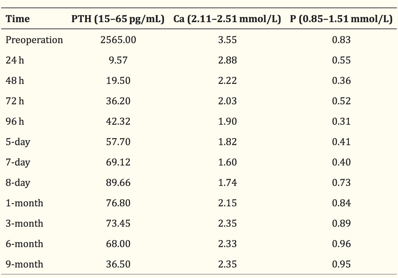 表1 患者PTH、钙和磷水平的术前和术后变化