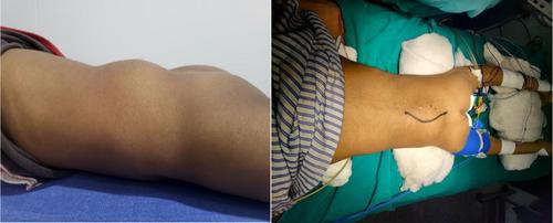 图1、腰骶区肿胀提示脂质脊膜膨出
