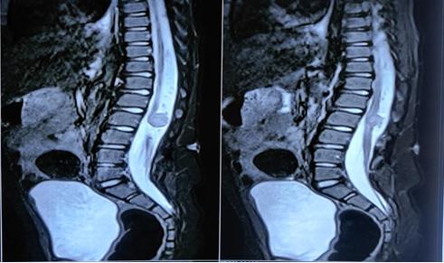 体格检查时,患者是警觉和有方向的;上肢力量5/5,左下肢力量5/5,右下肢力量4/5。与左下肢相比,右下肢的感觉减弱,反射正常,双侧足底反射完整。直肠张力正常,没有鞍状麻醉。背部检查发现腰骶部有一大块柔软、非触痛、非搏动性肿胀,约4×4cm,无一簇毛发(图1)。