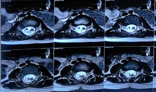 图3、MRI脊柱轴位图显示脊髓纵裂,其特征是脊髓在D12水平以下纵向分裂成两个半索