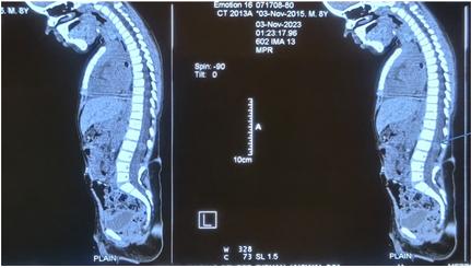 图4、患者的CT扫描显示L2-5后弓缺损,椎管内骶骨占位性病变