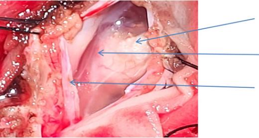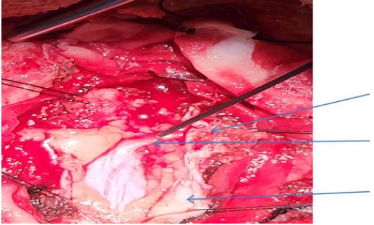 图、6术中图像显示硬脑膜、蛛网膜和下面的皮样肿块的开放视图