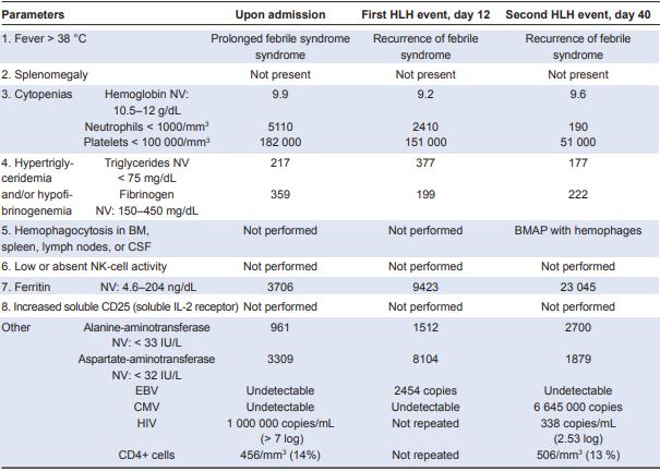 本病例患者的第二个事件显然与巨细胞病毒感染有关,具有高病毒载量。在HIV感染未得到控制的患者中,如果有很高的HIV-1/a和a-1,并且有大量的HIV-1/4或C-4/C,但在a-r-t起始时,应考虑免疫重建炎症综合征(IRIS)考虑到持续的CD4+淋巴细胞减少和BMAP与HLH相容的事实,排除了IRIS。