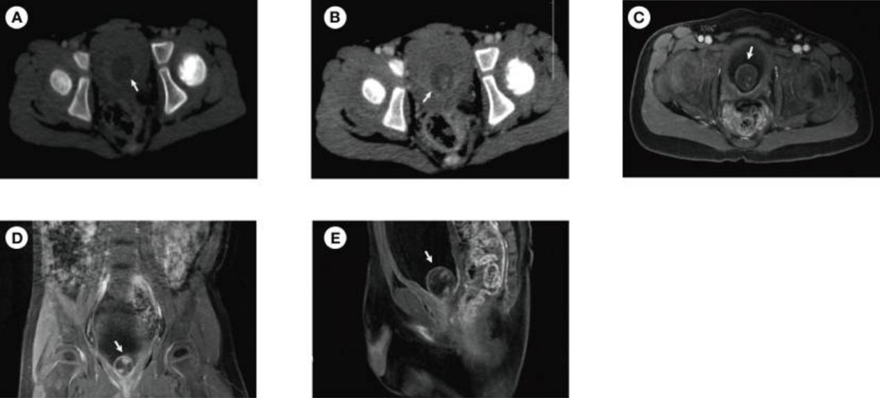 图1 术前患者的CT和MRI(A) CT平扫显示圆形、低密度、边缘良好的膀胱病变(1.9×1.8cm)。(B) CT增强扫描显示病变包膜中度圆形增强,病变实质内有小片状增强的高密度影。MRI显示一个囊性病变(1.9×1.9 cm),病变包膜呈环形低信号,横向(C)、冠状(D)和矢状面(E)有一个小片状增强的病变实质。图像中的白色箭头表示病变