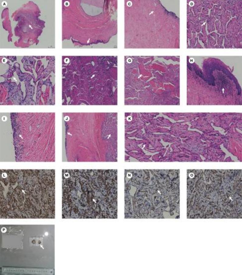 图2 病理图(A) 低倍镜下组织的病理形态。(B) 组织内可见多层鳞状上皮。(C) 组织内可见纤维结缔组织。(D,E)组织内可见血管网腔隙。(F) 在组织内可以看到神经组织。(G) 组织内可见平滑肌。(H) 组织内可见慢性炎症细胞。(I) 组织内可见膀胱黏膜。(J) 组织内可见膀胱粘膜和海绵体。(K) 高倍镜下可以在组织内看到平滑肌。(L) Calponin(+)。(M) 肌动蛋白(+)。(N) SMA(+)。(O) Desmin(+)。(P) 膀胱肿物的大体标本。图像中的白色箭头表示典型的病理结果
