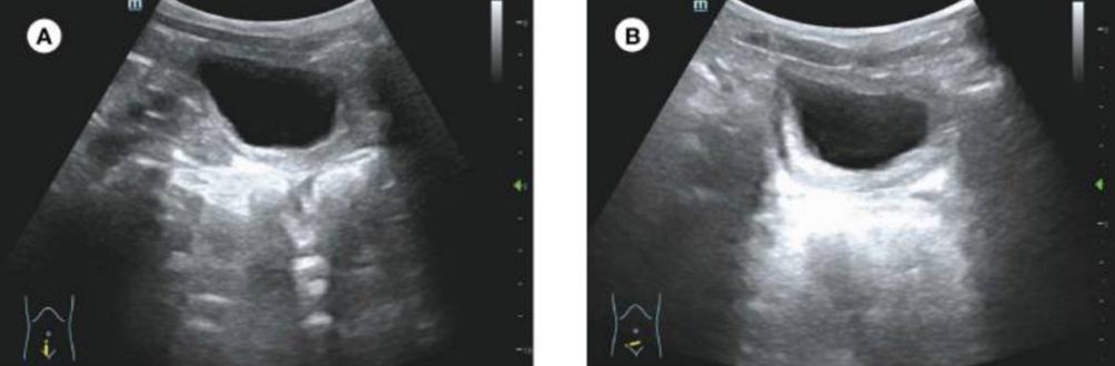 图3 患者手术后10个月的超声检查。(A,B)超声检查未发现膀胱有明显异常