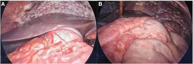 图1 (A) 腹膜和肠管表面的某些部位可见大量小结节。(B) 肿瘤浸润整个网膜,形成一个大而牢固的肿块