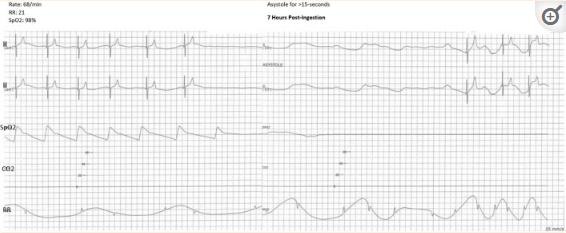 予维持性静脉输液治疗,但没有额外的干预。晚上11:00左右,即首次摄入约7小时后,患者仍在睡觉,但很容易醒来,没有其他中毒迹象。当醒来时,反应灵敏,定向感无异常。走动小便无异常,然后回到床上睡着了。事件发生约5分钟后,遥测警报响起,表明心搏停止和呼吸暂停发作时间超过15秒(图1)。患者不能正常刺激醒来,需要胸外按压,增加呼吸和恢复心率。没有观察到相关的癫痫发作活动。事件发生后,患者回到睡眠状态。他的心率显示心动过缓,在每分钟60次的范围内,接受了一剂0.1毫克的甘罗酸钠治疗,心动过缓得到缓解。然后被转移到重症监护室(PICU)进行进一步的监测。