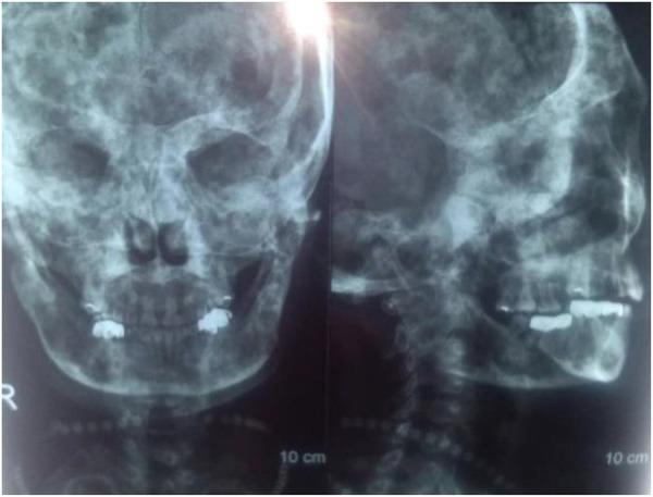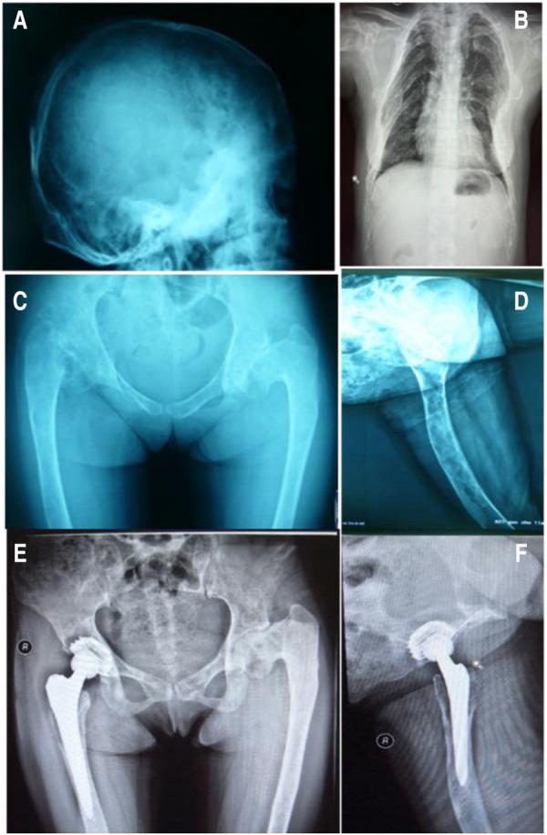 2009年12月,一名24岁的女性患者因“摔倒后右髋关节疼痛和活动受限1年”入院。该患者在一年多前摔倒后出现右髋关节疼痛,活动受限。休息后疼痛略有缓解,可以行走。根据提供的信息,患者有10年多发未经治疗的骨骼异常病史,包括双髋内翻畸形、屈曲挛缩、右髋内收畸形和双侧膝外翻畸形。入院时通过X光检查发现,下肢长骨和颅骨中存在多个骨致密影和磨玻璃影的囊性区域,骨皮质变薄,双侧股骨干和颈干角变形(图1)。此外,患者出生时有多处皮肤色素沉着,14岁时被诊断为面部骨骼畸形。患者月经正常,有第二性征,在24岁时自然分娩。