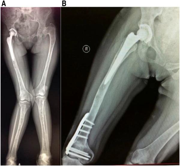 患者2009年至2013年间接受了四次静脉输注唑来膦酸5mg,同时口服补钙。2010年7月进行右侧全髋关节置换术(THA)。术后髋关节X线片见图1。碱性磷酸酶和骨钙素水平分别为538 IU/L和192.5 ng/ml。2013年12月,患者接受了矫形外科手术和右髁上截骨(图2)。入院时,碱性磷酸酶和骨钙素水平为403 IU/L和246.30 ng/ml。2015年5月,患者因跌倒导致左股骨干骨折,并接受了钢板和螺钉内固定(图3)。根据术后组织病理学,最终诊断为纤维发育不良。2015年12月,移除右侧股骨板,以防止应力集中和随后的股骨干骨折。尽管患者在随访期间没有出现明显并发症,但于2017年和2018年在另一家医院接受了颌下感染和下颌骨坏死的治疗(图4)。