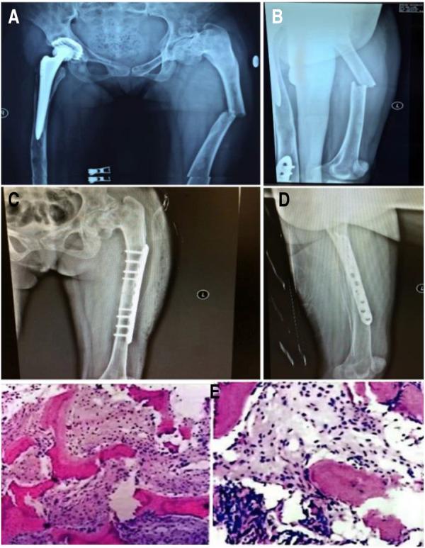 图3 轻微外力作用下左股骨干骨折。(A,B)术前x光片,(C,D)术后x光片;(E)术后病理学