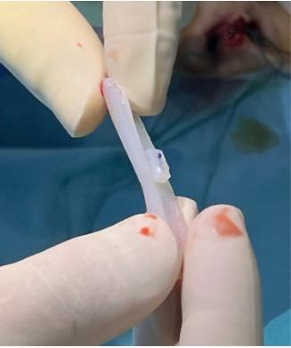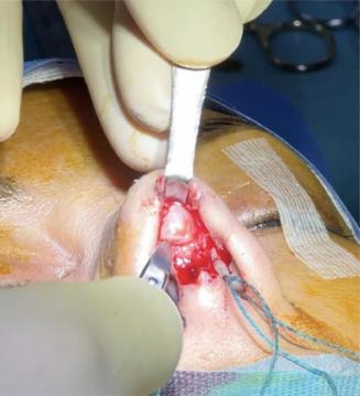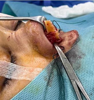 修复手术从之前的疤痕开始,经鼻小柱切开,在皮下切除鼻背和鼻根。硅胶植入物很容易找到,被它的囊覆盖着(图1)。切开包膜后,取出硅胶植入物,状态良好,没有破裂或中断(图2)。用剪刀分离皮瓣进行解剖。纤维脂肪层,或称鼻浅肌腱神经系统(SMAS),用镊子轻轻缩回,并用虹膜剪刀钝性剥离抬高。包膜上的皮肤很薄,于是决定保留包膜,用它来重建鼻背部。在手术过程中,用以下溶液冲洗植入囊:庆大霉素(80毫克)和头孢唑啉(1g)溶于500 mL盐溶液(图3)。为了改善鼻轮廓,将1.5mL软骨切片,厚度为1mm,用皮瓣刀片制备,引入胶囊。软骨取自患者右第六根肋骨。