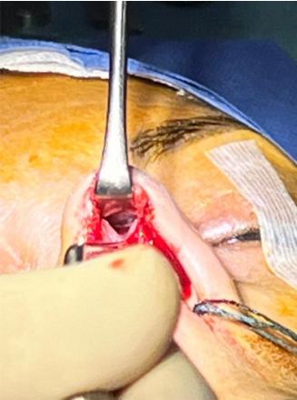 该研究涉及一名48岁的患者病历,除了以前的隆胸手术和闭合性鼻整形手术外,没有重大的病史。她的注意力集中在15年前隆鼻手术中植入的一种封装硅胶植入物上。对球形鼻尖的不满促使她寻求鼻子的美学改良,没有报告任何具体的症状、感染或呼吸问题。完整的半圆柱形假体在尾端位置过长,破坏了鼻翼软骨穹隆,导致鼻尖呈球根状。患者提供的书面知情同意本研究遵循赫尔辛基宣言的原则。