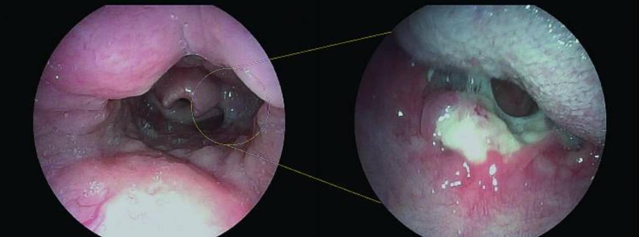 图1 鼻咽镜检查显示咽部有溃疡病变