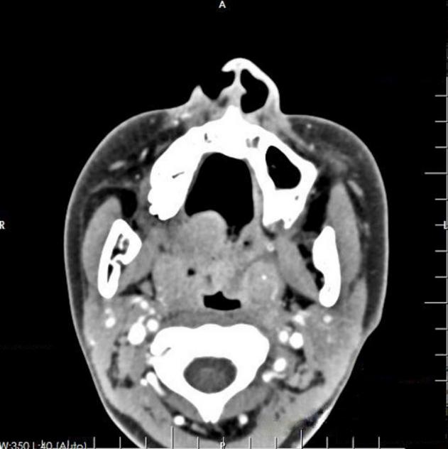 图2 增强CT显示悬雍垂轻度肿胀,双侧扁桃体增大,左侧扁桃体点状钙化